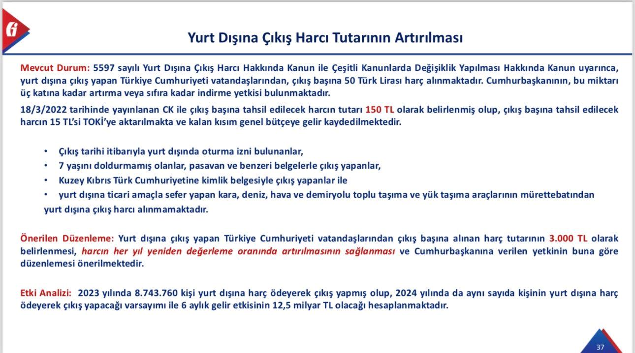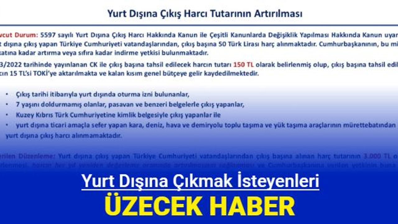 Mevcut çıkış harcı 150 lira olarak uygulanıyor. Yurt dışına gitmek isteyenler bu parayı vererek yurt dışı çıkış harç pulunu alabiliyordu. Gelecek yeni zam ile bunun 10 kat artacağı bildirilmişken yeni açıklamada bunun 3 bin liraya çıkacağı açıklandı.