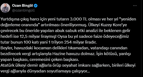"Yurtdışına çıkış harcı için yeni tutarın 3.000 TL olması ve her yıl 'yeniden değerleme oranında' artırılması öneriliyormuş. Ülkeyi Kuzey Kore'ye çevirecek bu öneride yapılan abuk sabuk etki analizi ile beklenen gelir hedefi ise 12,5 milyar liraymış! Oysa bu yıl sadece faize ödeyeceğimiz tutar bunun 100 katı yani 1 trilyon 254 milyar liradır.