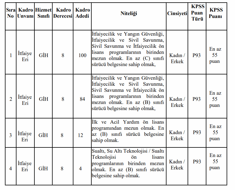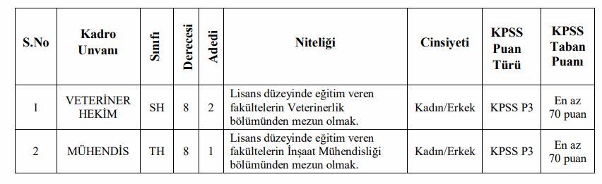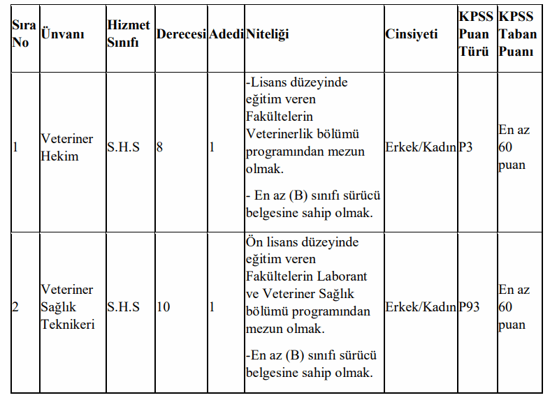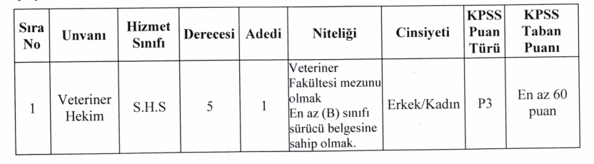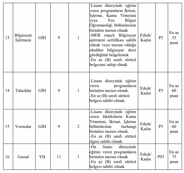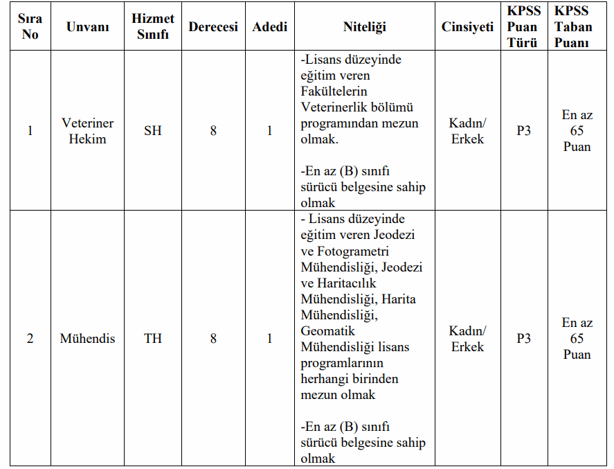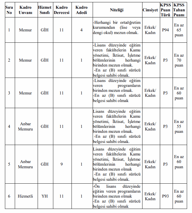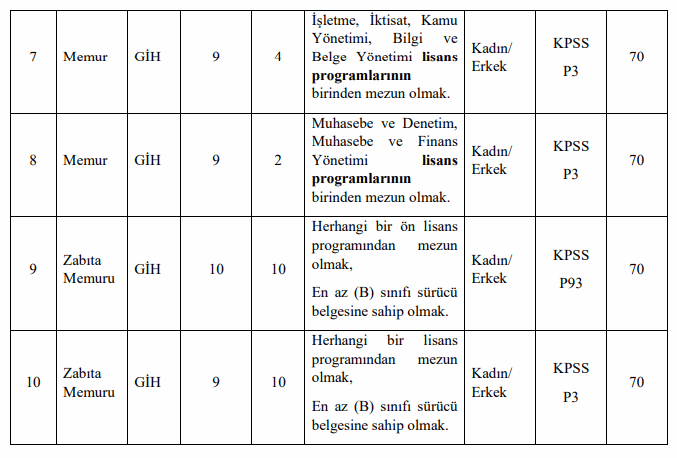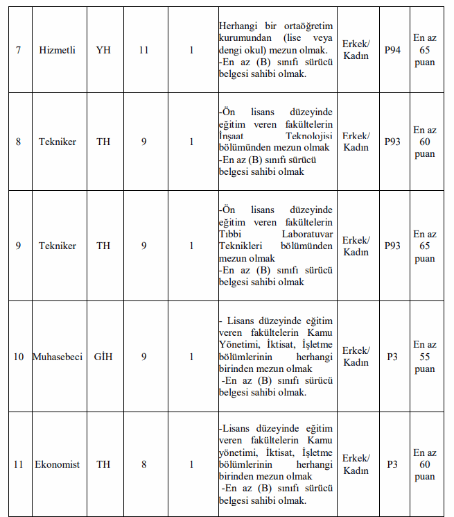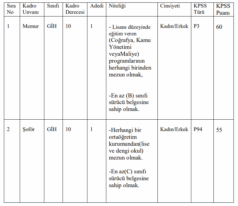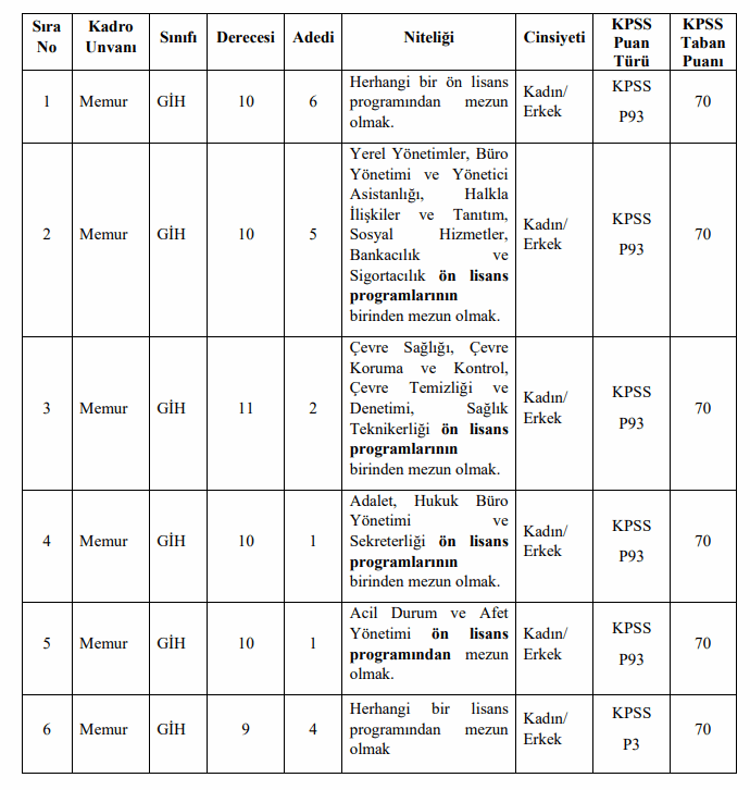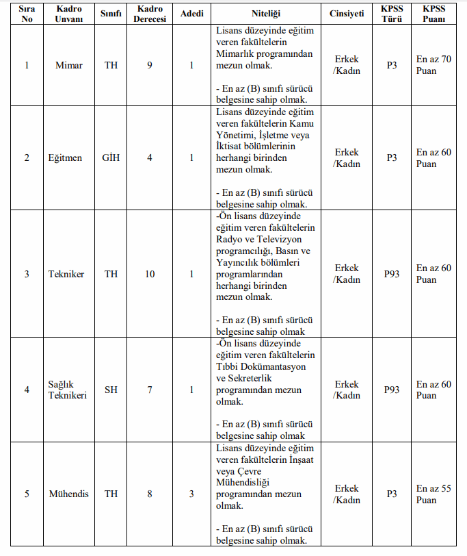 Belediyelere en az lise mezunu zabıta, hizmetli, sağlık teknikeri, düz memur,itfaiye eri, tahsildar alımı.