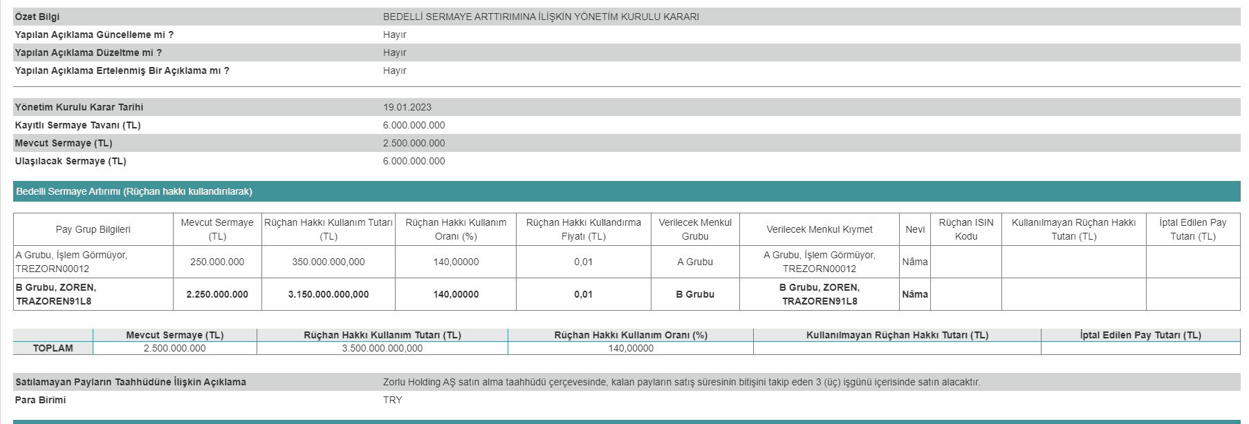 - Yeni pay alma haklarının kullandırılmasından sonra kalan payların B grubu olarak; 2 işgünü süreyle nominal değerden düşük olmamak üzere Borsa İstanbul AŞ Birincil Piyasa'da oluşacak fiyattan Borsa'da satılmasına,